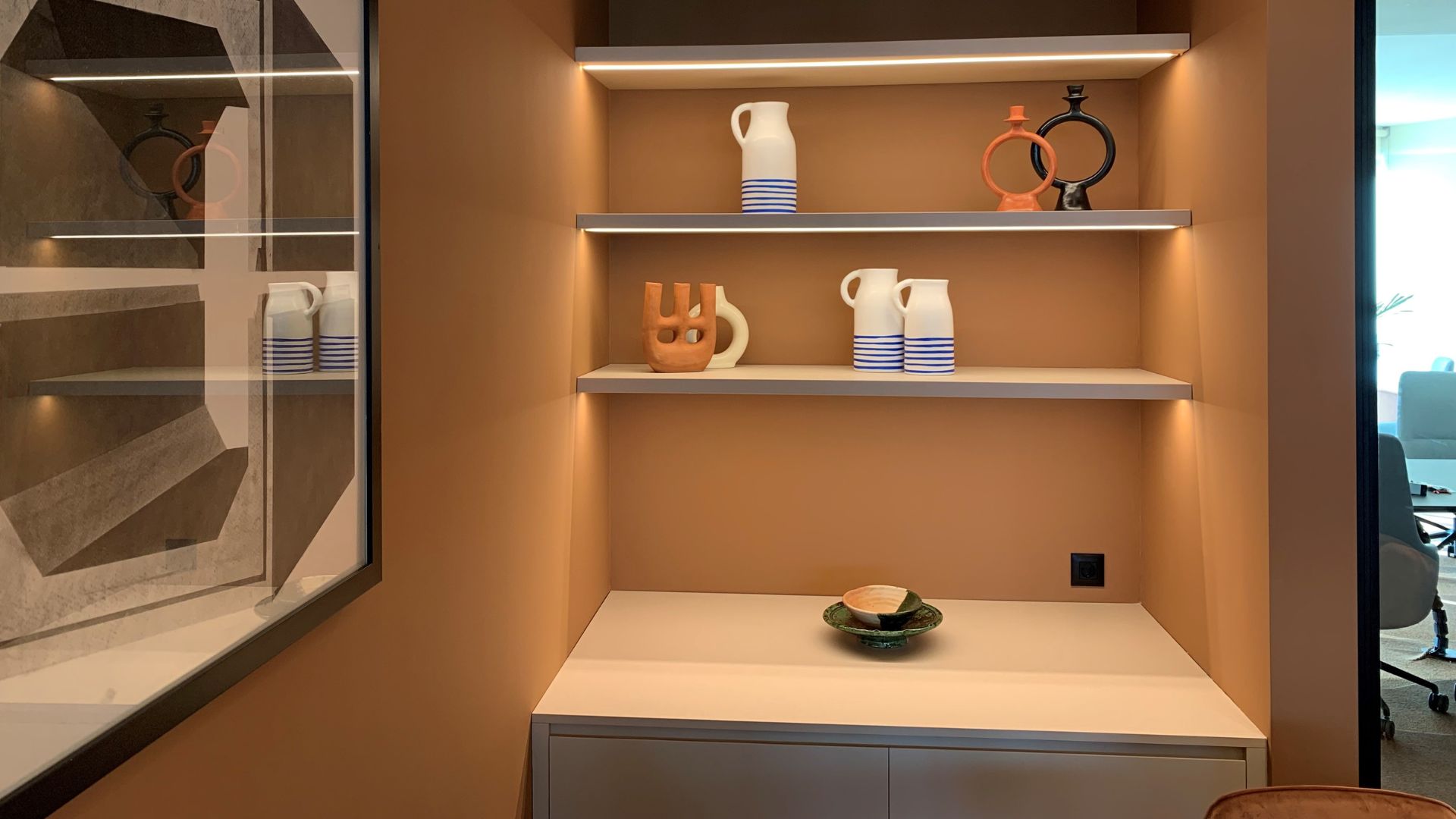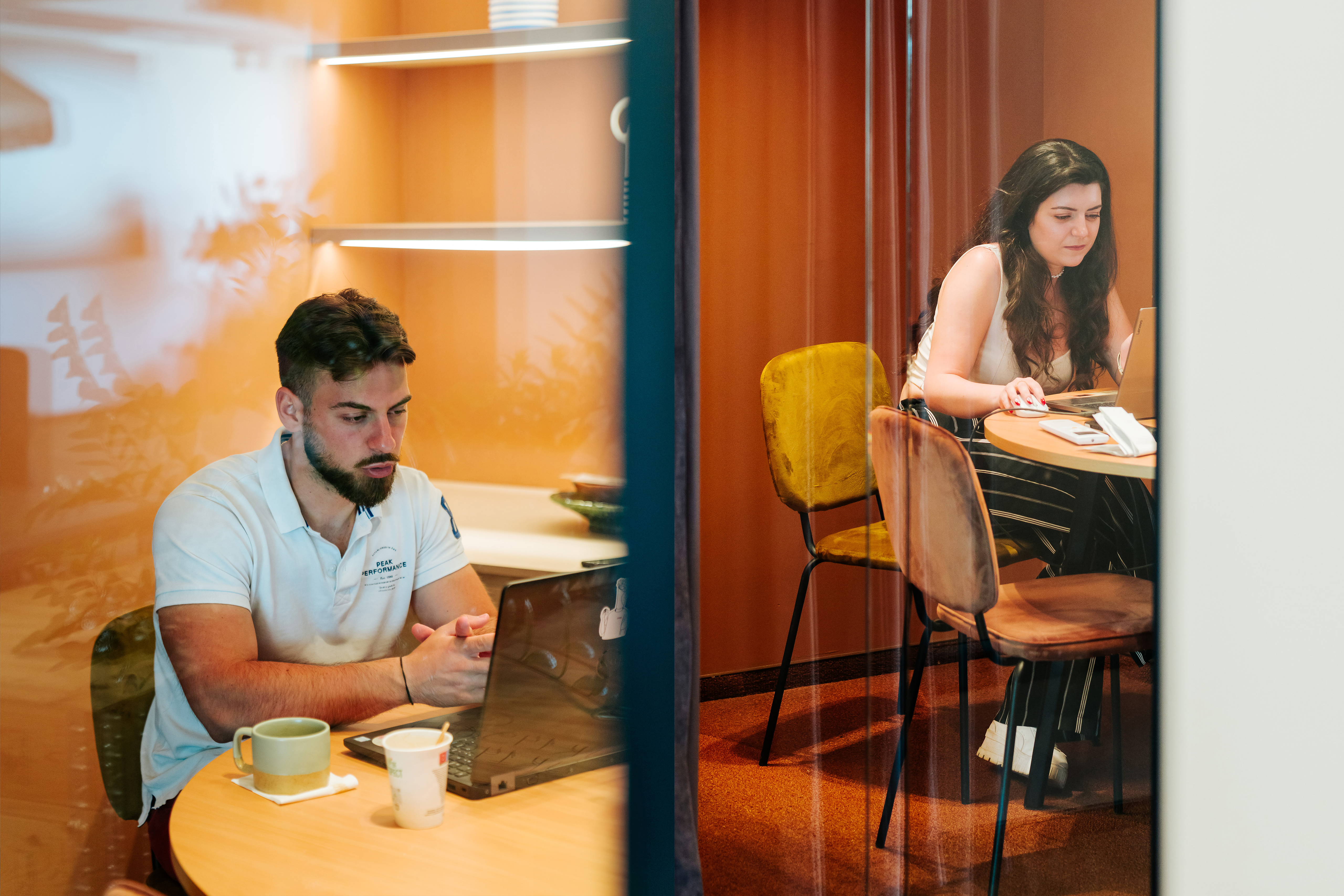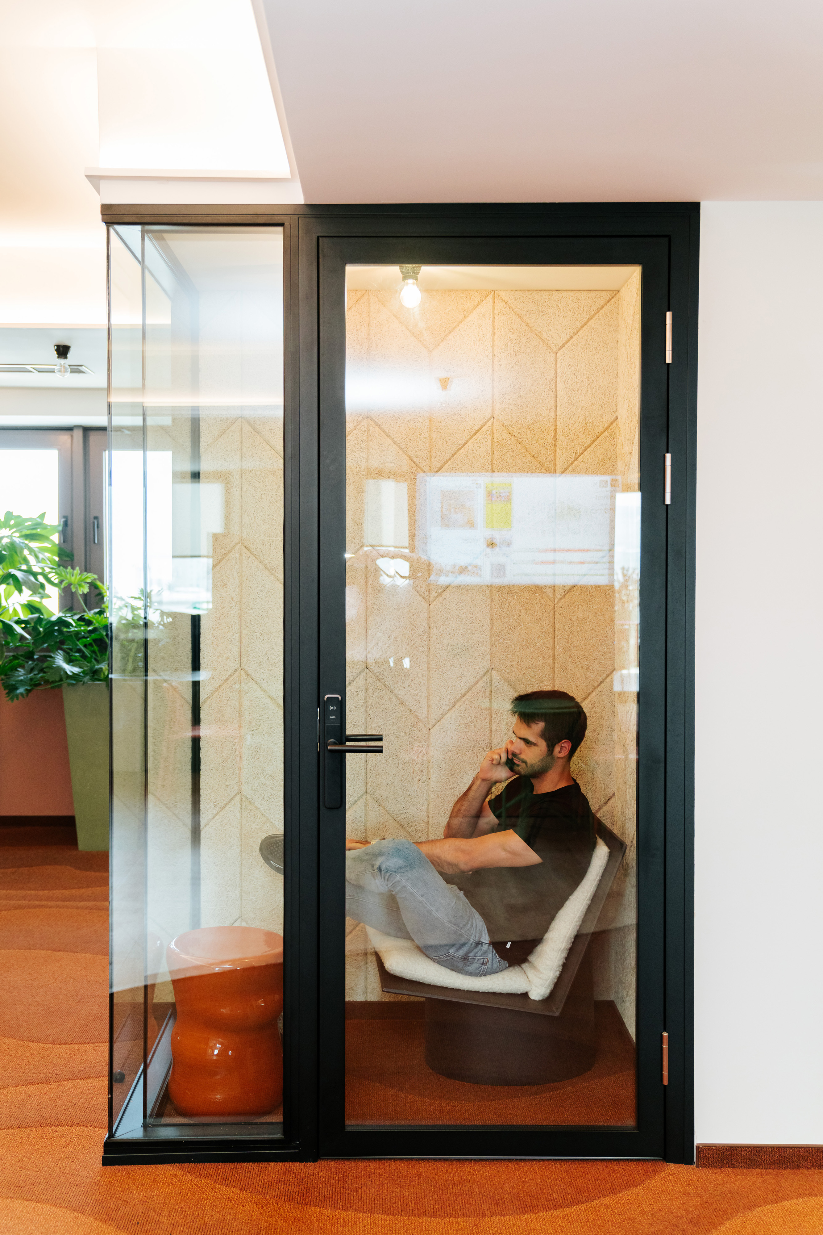With comfortable chairs and two small tables for individual use. Make an undisturbed call in our soundproof phone booth.