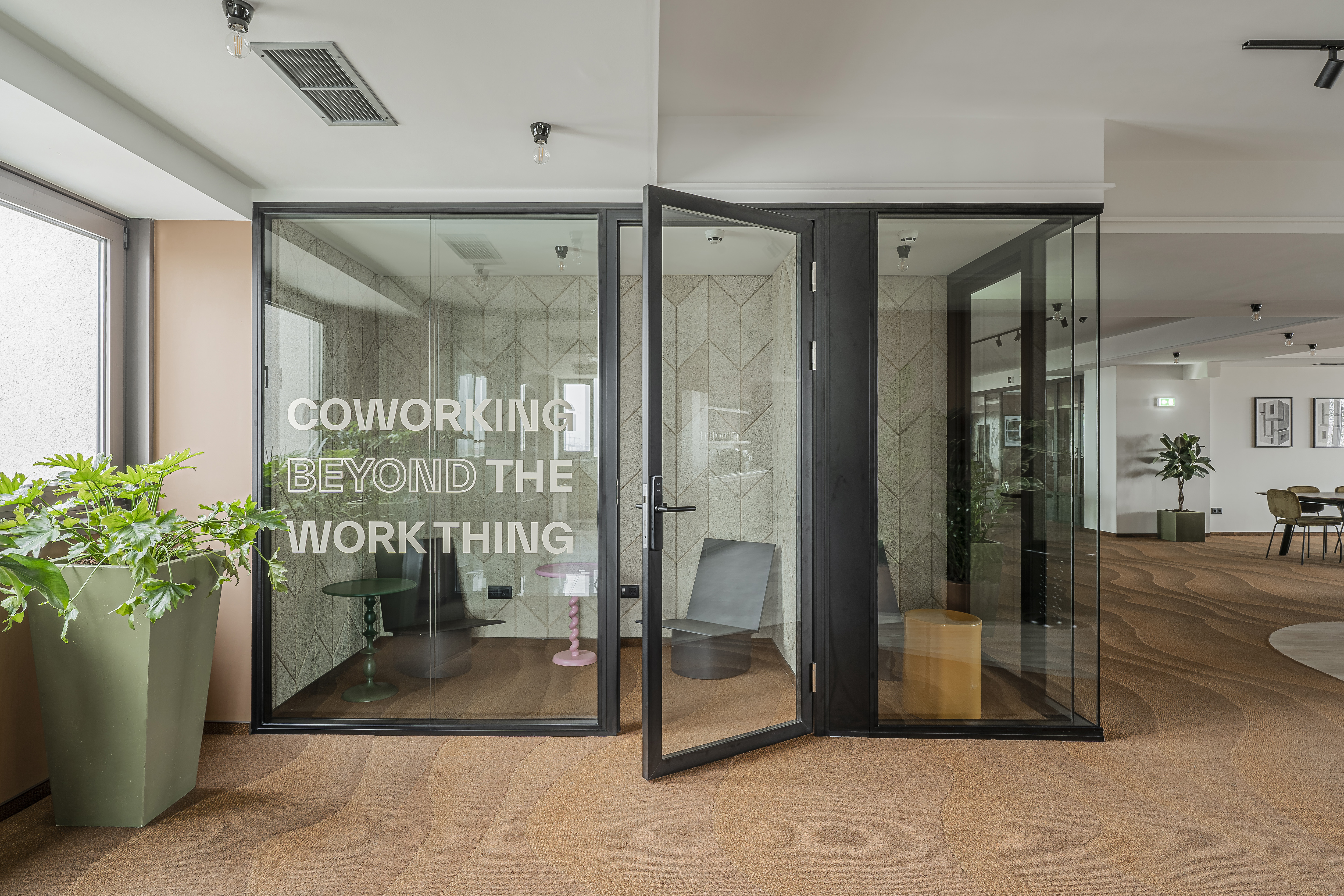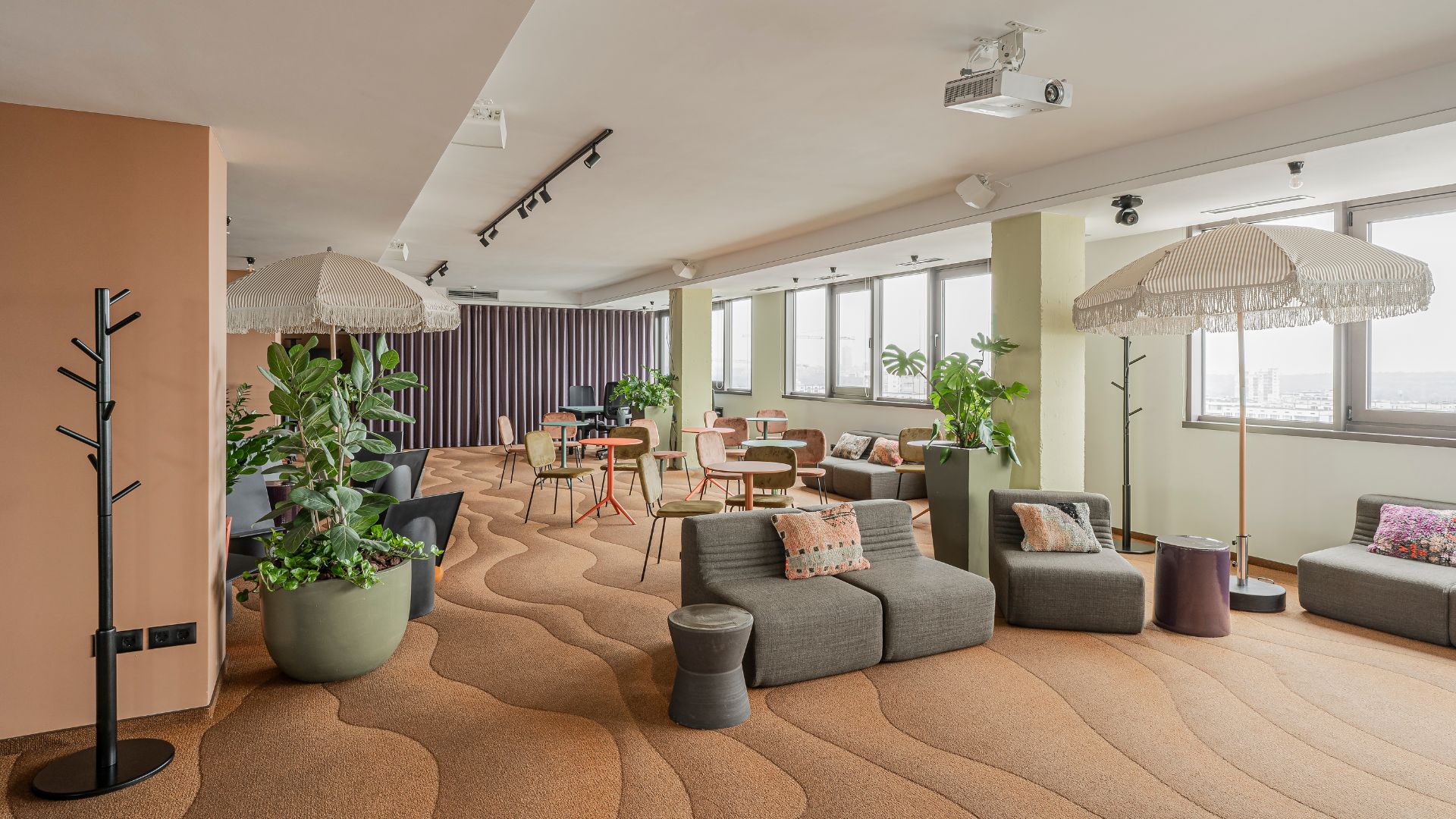 Our spacious event space seamlessly blends with our coworking area. It can be used with comfortable sofas for a relaxed setting or easily reconfigured for larger events to fit more people. Standout feature is the video wall with built-in cameras for live recording.